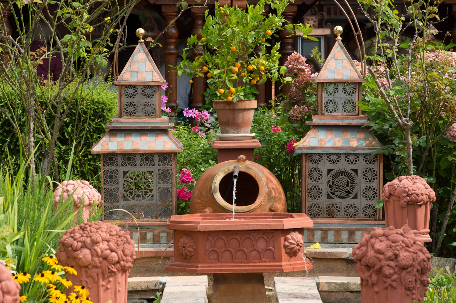 Chaque jardin a son bassin ou sa fontaine, évoquant parfois les jardins luxuriant du monde oriental. Huit d’entre elles portent les prénoms des petits enfants auxquels elles sont dédiées.